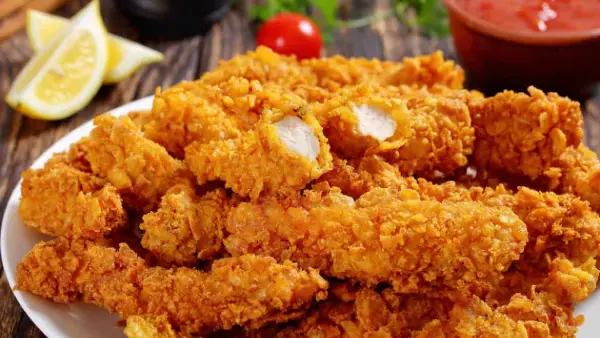 Boneless chicken strips breaded and deep fried. Kids favorite! it wraps you in crispiness!