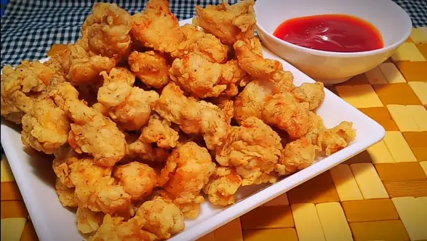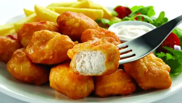 Bite-sized pieces of mildly seasoned minced chicken which are breaded and deep-fried.